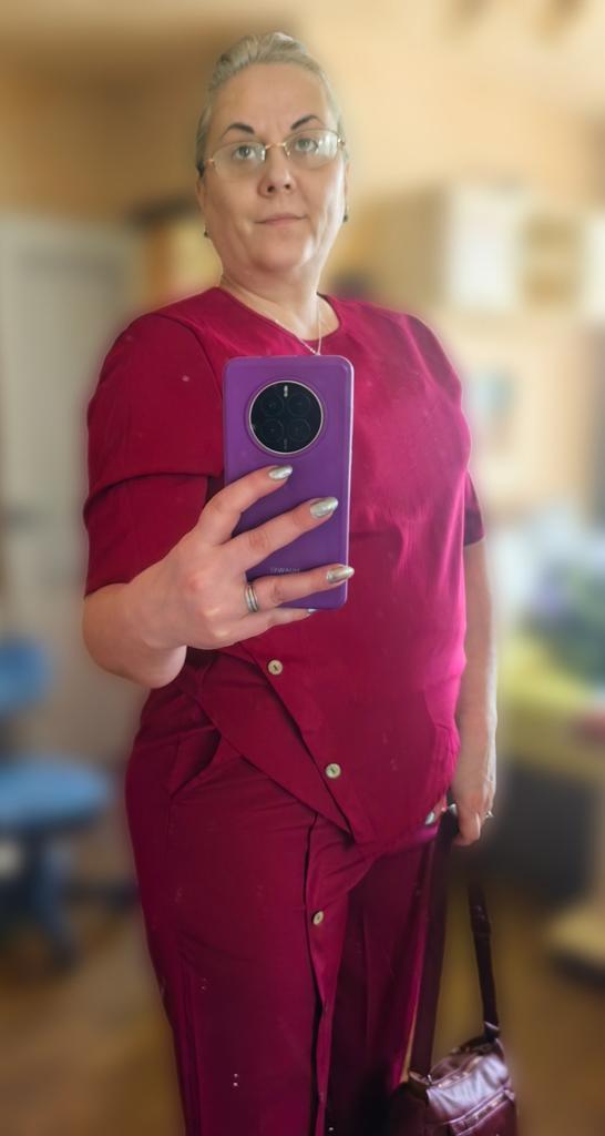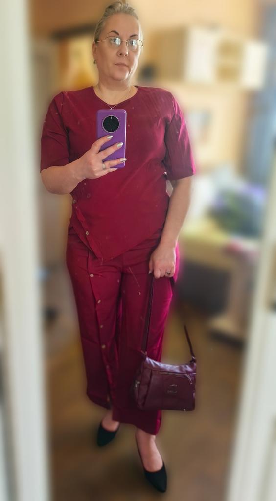 The trousers fit perfectly. But the blouse is like 2 sizes too small