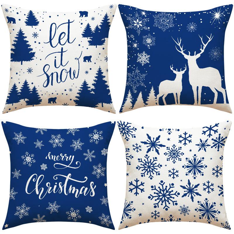 New Blue Deer Christmas Pillowcase Linen Printed Pillowcase Festive Indoor Sofa Decoration Cushion Cover
