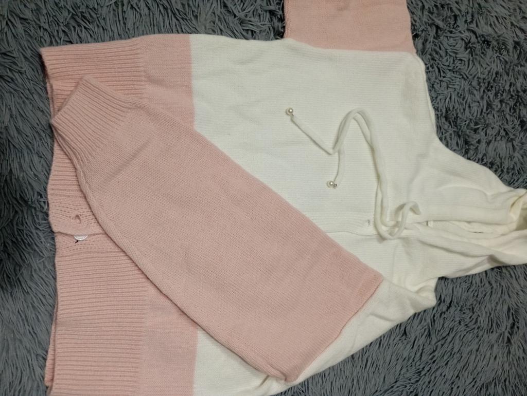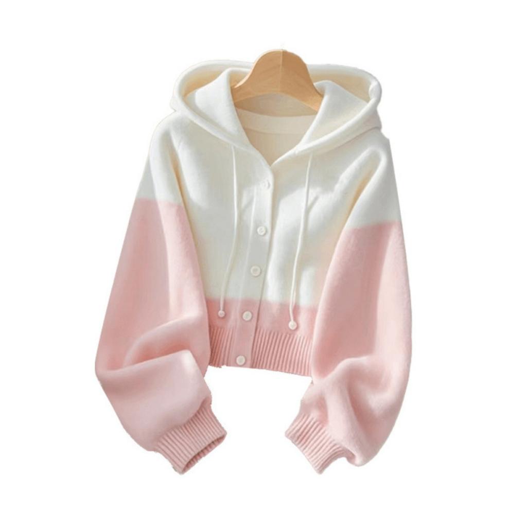 Korean Pink Patchwork Hooded Knitted Sweater, Women's New Lazy and High-end Knitted Top