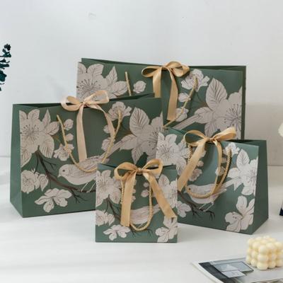 Thicken Luxury Green Handhold Paper Bag Printing Floral Bird with Ribbon Wrapping Shopping Bag