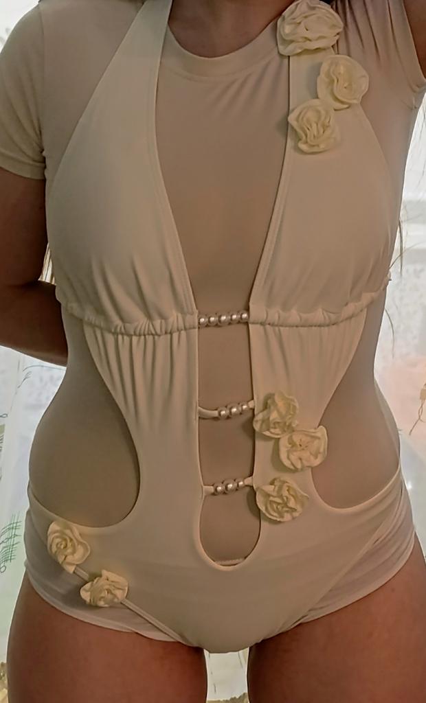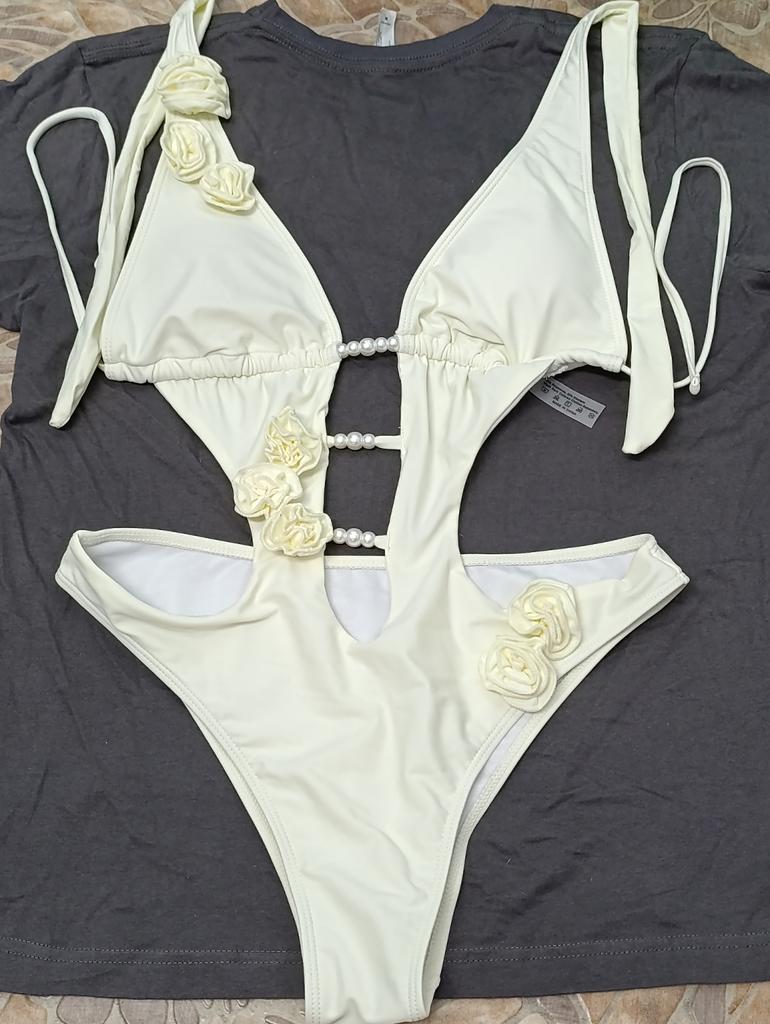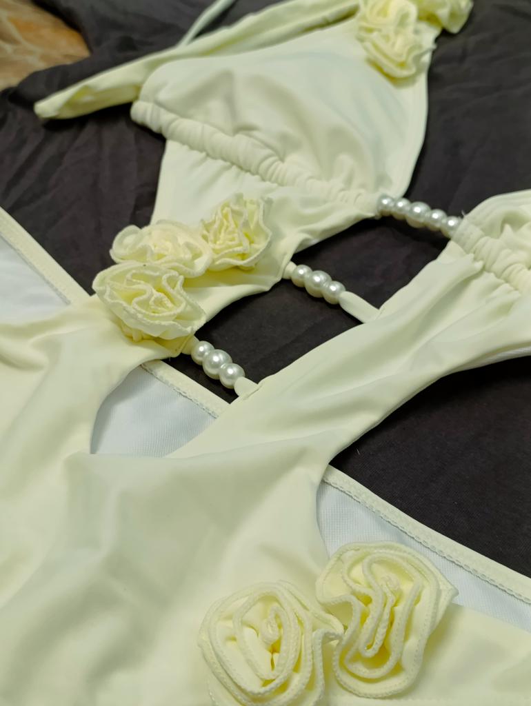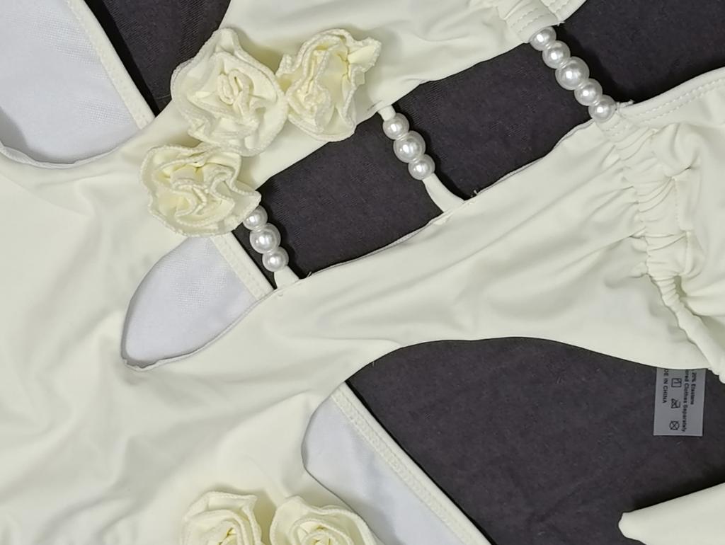 Solid Color Tie Pearl Flower Decoration Sexy One-pieces Bikini for Women