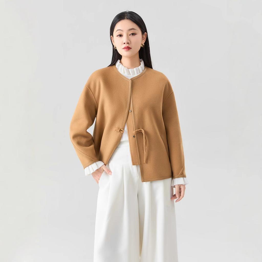 Women's Leather Chinese Knot Woolen Coat Simple Retro Short Round Neck Fleece Coat Warm