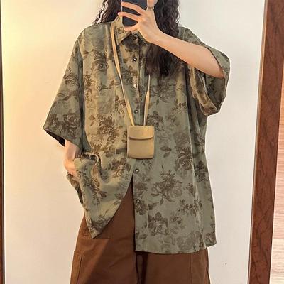 Women Printed Short Sleeved Shirt Chinese Style American Retro Casual Tops Turn-down Collar Single Breasted Top with Tie