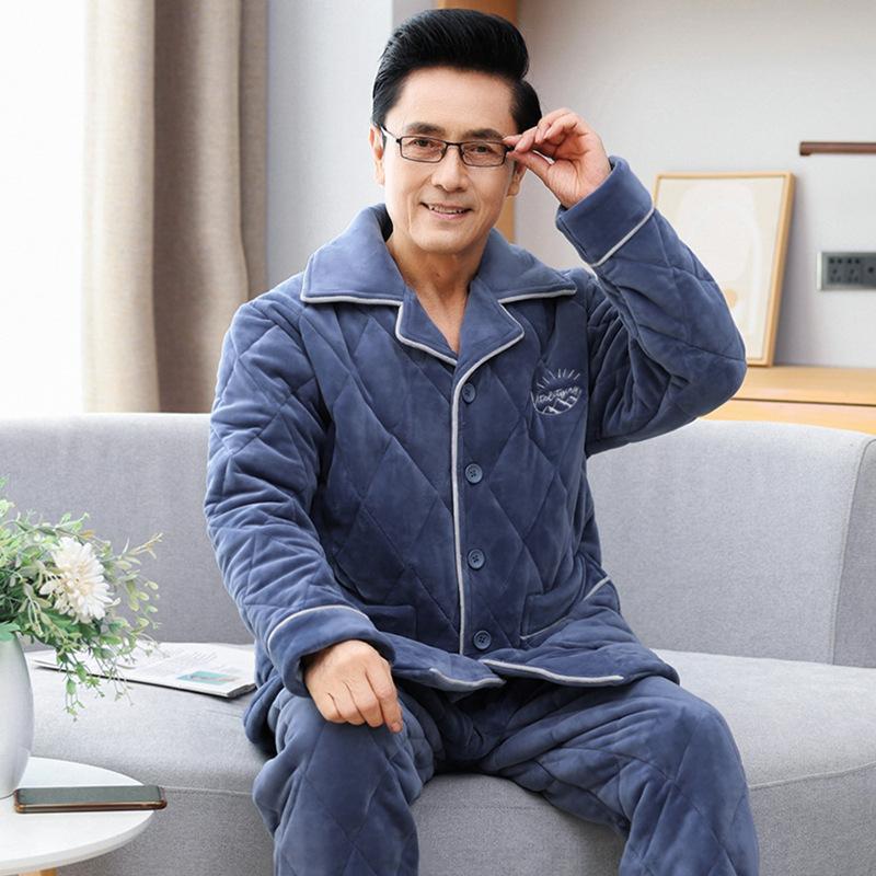 Winter Coral Fleece Men's Pajamas Three-layer Thick Quilted Middle-aged and Elderly Grandpa Flannel Home Service Padded Jacket Suit