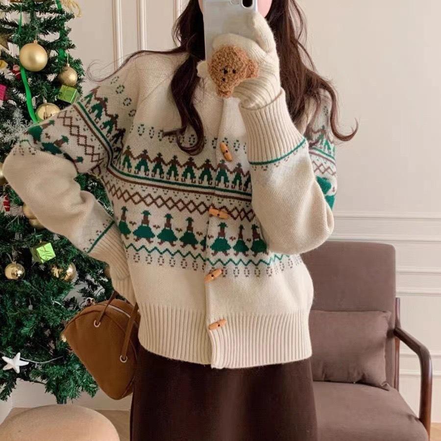 Retro Style Red Christmas Jacquard Knitted Cardigan Women's Autumn and Winter Design Sense Horn Button Crew Neck Sweater Jacket