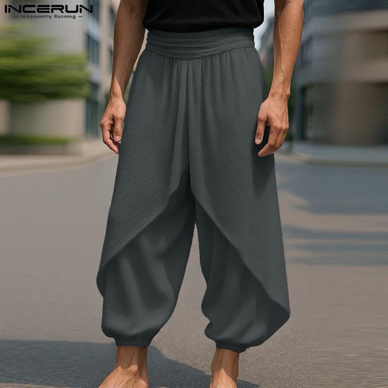 INCERUN Men Elastic Waist Irregular Layers Texture Casual Long Harem Pants Trousers