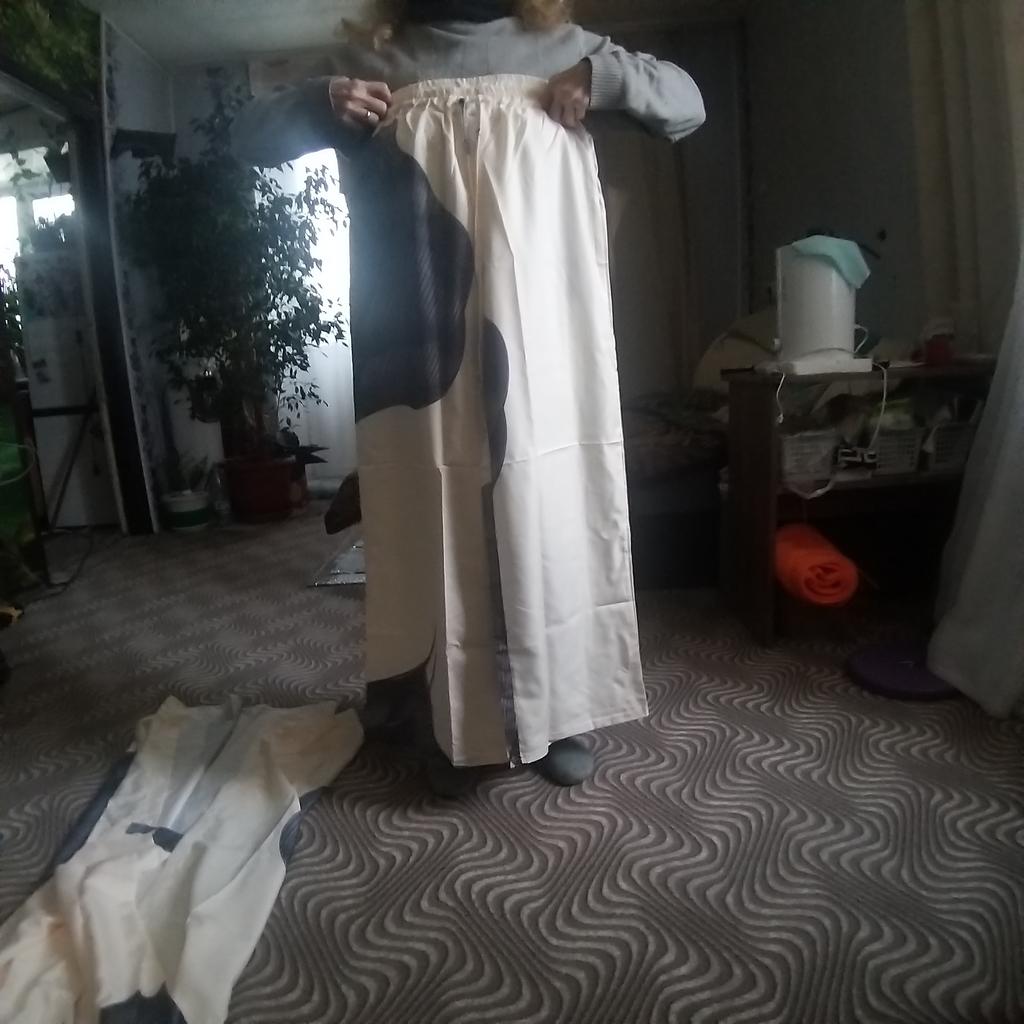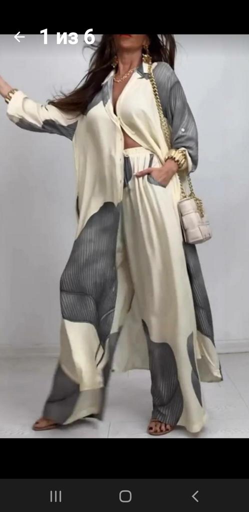 Women's Loose Fit Long Shirt and Wide Leg Pants Set Casual Two Piece Outfit In Beige with Grey Pattern