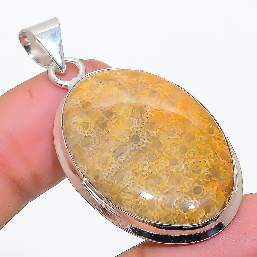 Fossil Coral Gemstone 925 Solid Sterling Silver Jewelry Pendant 1.85" SU-10228