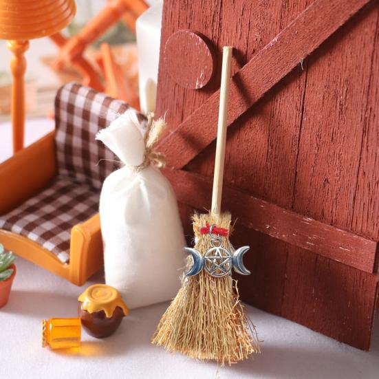 Mini Witch Broom Car Pendant Wooden Halloween Ornament for Rearview Mirror 1:6/1:12 Miniature Doll Houses Scale Accessory