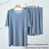 Couple Ice Silk Pajamas Set Summer Women Round Neck Short Sleeve Long Pants Men Shorts Seamless Homewear
