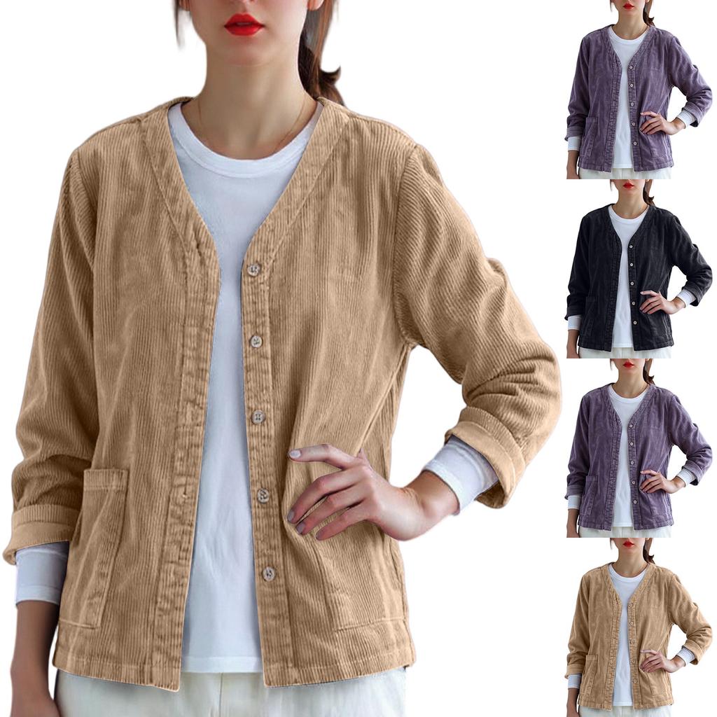 Women's Retro Corduroy Cardigan Loose V-neck Striped Velvet Shirt Top Jacket