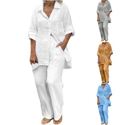 Fashion Women's Casual Solid Color Long Sleeve Shirts Cotton Linen Pants Suit