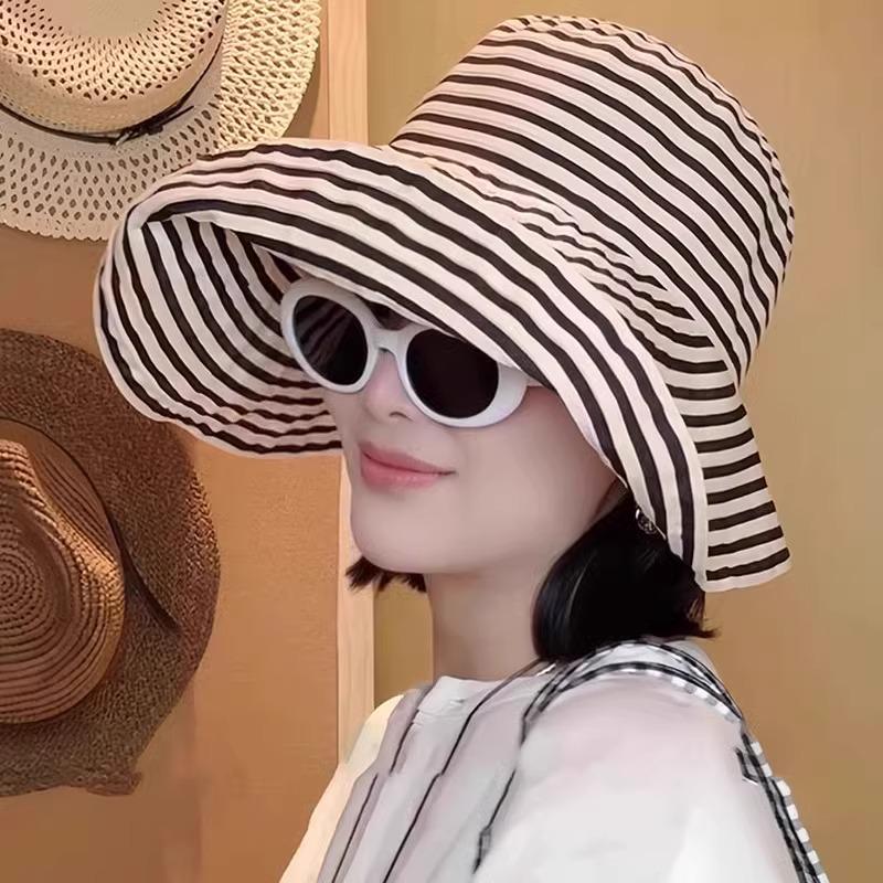 Women's Japanese Style Striped Summer Bucket Hat, Foldable, Large, with Sun Protection.