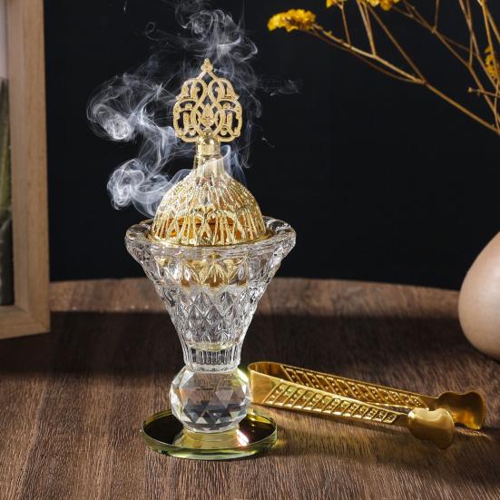 Constructed from high-quality artificial crystals, this burner guarantees longevity. The metal craftsmanship and Arabic-style design add a touch of sophistication to any decor. For added safety, the burner features a protective lid to contain ash and ensure secure incense burning. Elevate your ambiance with our exquisite incense burner today!