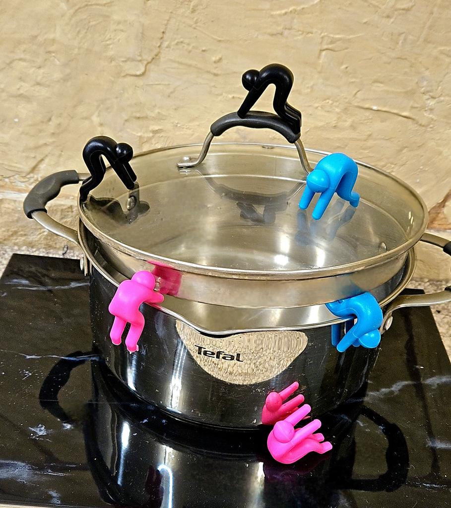 Funny little people - little kitchen helpers🧡 The pot lids no longer snap shut. The little people are holding their ground)) May these little heroes make life in the kitchen a little more fun and convenient) They are made of silicone, will withstand high heat. You can order one or all 6, make a nice gift for your loved ones, so that food doesn't run out of the pots)) They hold on tightly, thanks to their shape. I wholeheartedly recommend them, they are cuties🧡