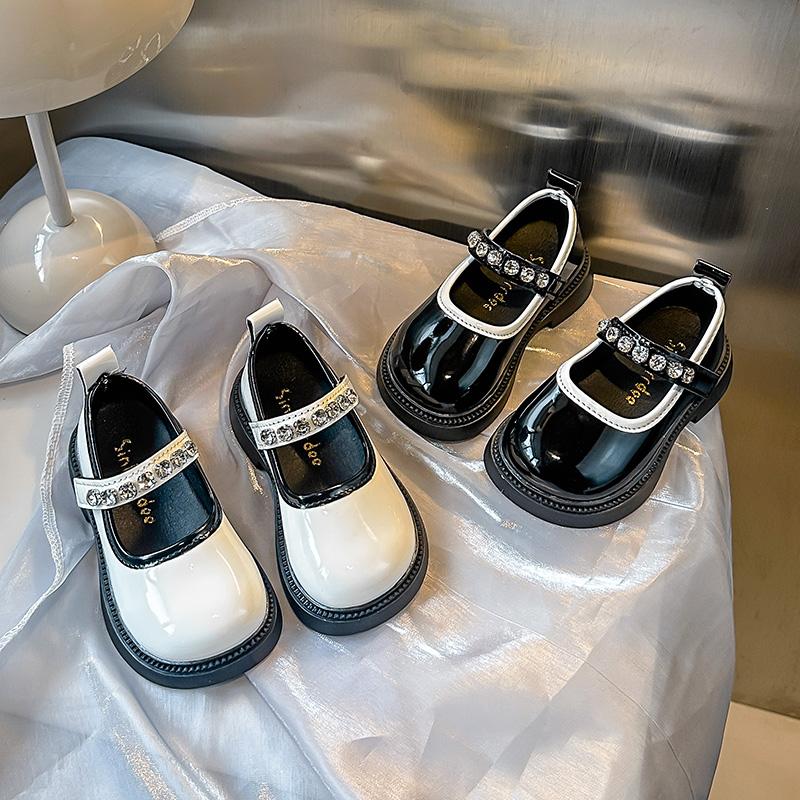 Girls Leather Shoes Black Glossy Kids Flat Shoes Round Toes Non-slip 2025 New Girls Princess Shoes Shiny Crystal Ins Trend Sweet