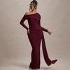 European and American Sloping Collar Long Sleeved Fashionable Temperament Solid Color Pleated High Waisted Long Dress