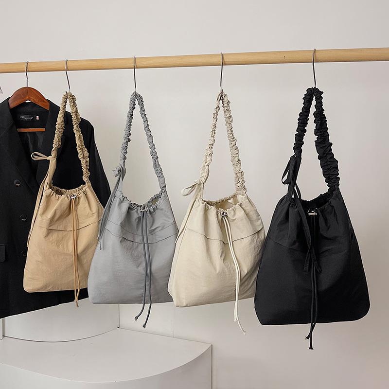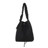 Ruffled Nylon Bucket Bag: Weighing 0.18kg, it has a lightweight nylon fabric finish, a bucket - shaped silhouette with ruffled handles, and a drawstring closure. Perfect for adding a casual, stylish touch to daily outings, shopping trips, or travel.