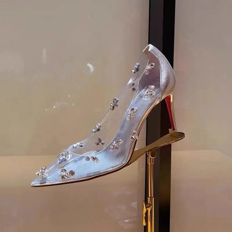 Silver Transparent Rhinestone High Heels Women 2025 Summer Banquet Red Bottom Fine Heel Crystal Wedding Shoes Tacones Mujer
