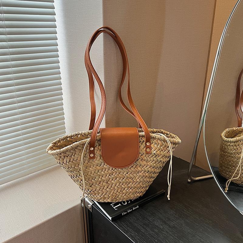 Straw Bag Women's New Trendy Popular Woven Shoulder Bag Bucket Bag Seaside Vacation Beach Bag