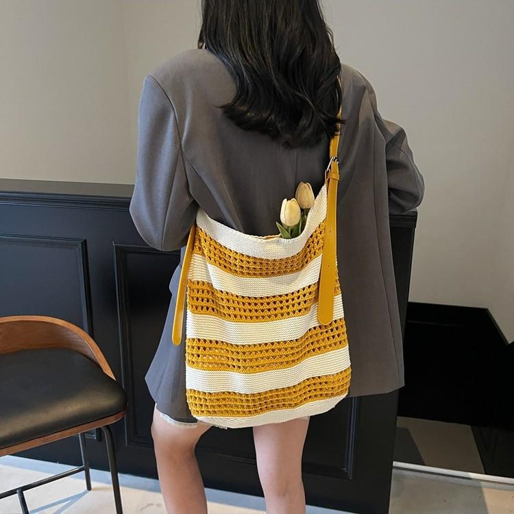 Bag Women's New Contrasting Color Woven Bag Fashionable Hollow Niche Light Luxury Tote Bag Vacation Beach Bag