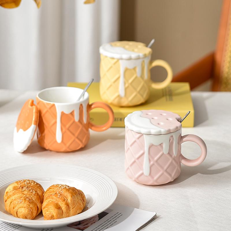 Creamy Style Biscuit Mug Ceramic High Looking Creative Cup with Lid Spoon Cute Girl Couple Drinking Water for Home Use