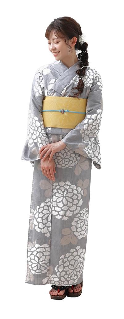 This is a three-piece yukata coordinated set consisting of a unique fabric yukata, an obi belt, and paulownia geta sandals.