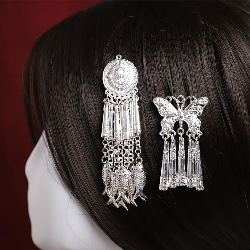 Antique Miao Silver Headdress Hairpin Retro Tassel Step Shake Women's Hanfu Warring States Robe Edge Clip Hair Accessories
