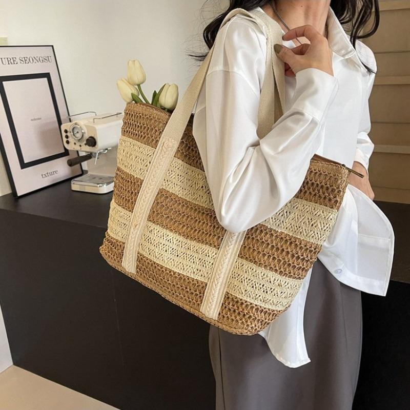 New Contrasting Straw Bag Portable Large-capacity Beach Bag Shoulder Casual Fashion Woven Bag Women's Bag