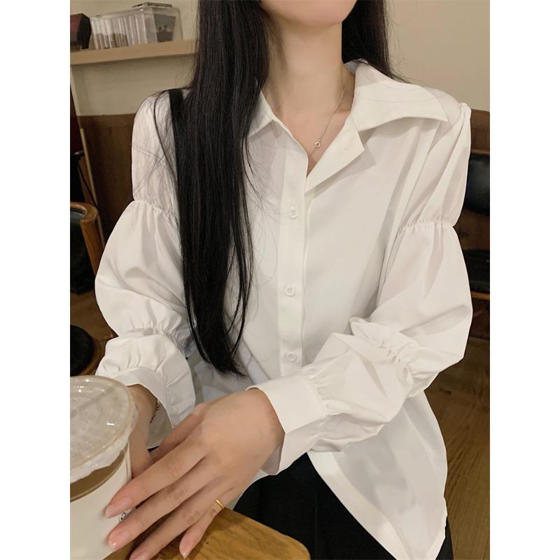 Fashion Niche Black Ladies Shirt with Buttons, French Retro Chic Bubble Long-sleeved Ladies White Top