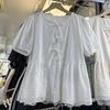 Blue French Vintage Bubble Sleeve Shirt for Women Summer Flowy Loose Fit Tummy Cover Casual Top
