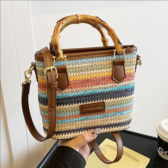 Striped PU Woven Handbag: Weighing 0.28kg, it has a unique woven texture, a striped color - blocked silhouette with bamboo - style handle, and supports single - shoulder or cross - body wear (120cm adjustable strap). Perfect for adding a bohemian, stylish touch to beach outings, vacations, or casual gatherings.