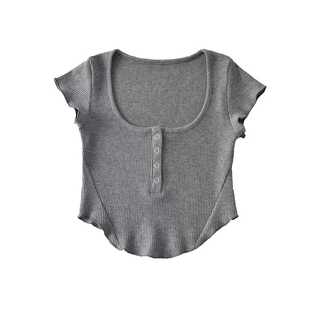 American Style Slim Fit U-Neck Buttoned Waffle Knit Crop Top for Women