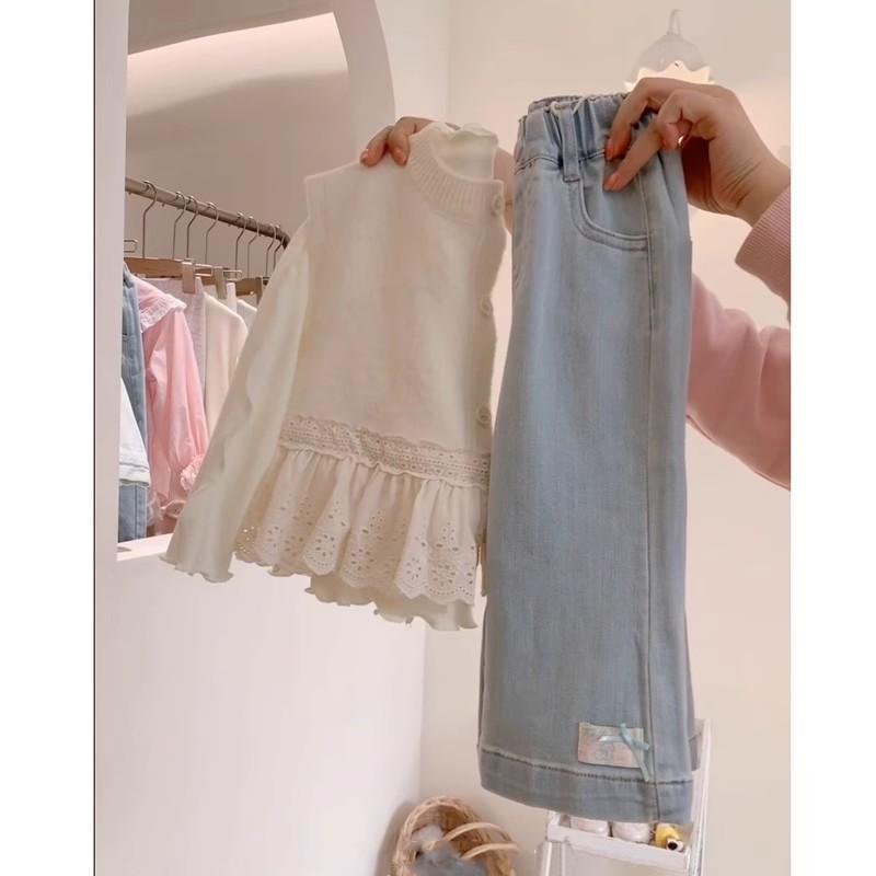 Discover the perfect blend of style and comfort with this charming spring outfit designed for girls. The set features a delicate lace-trim knitted vest that adds a touch of elegance to any occasion. Paired with the vest are trendy denim flare pants, offering a chic and fashionable silhouette. Crafted from high-quality cotton, this outfit ensures a soft and breathable experience, ideal for warmer days. Perfect for every little fashionista, this ensemble effortlessly captures the fresh vibes of spring.