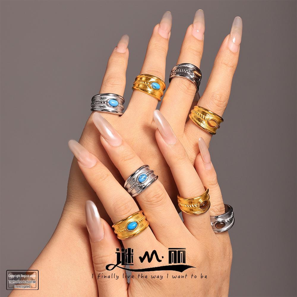 Mili Blue Turquoise Tiger Eye Stone Twist Pattern Stainless Steel Ring for Women, PVD Gold-Plated, Pinky Ring, In Stock