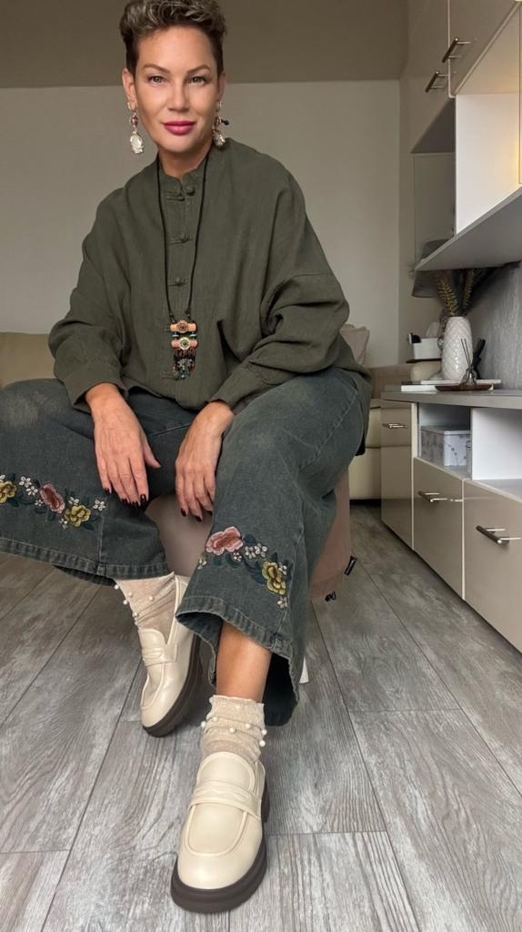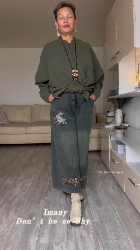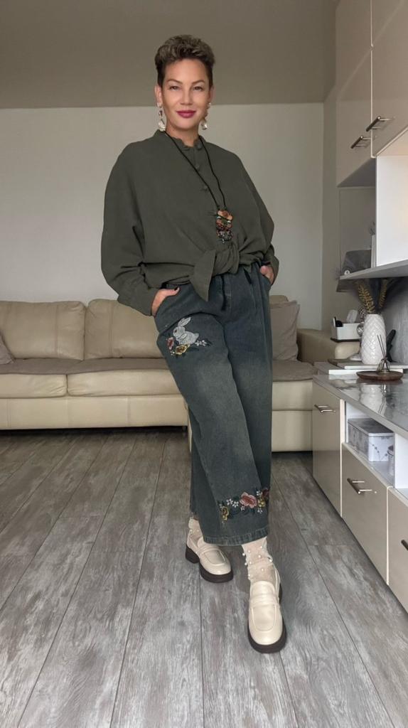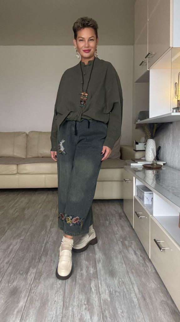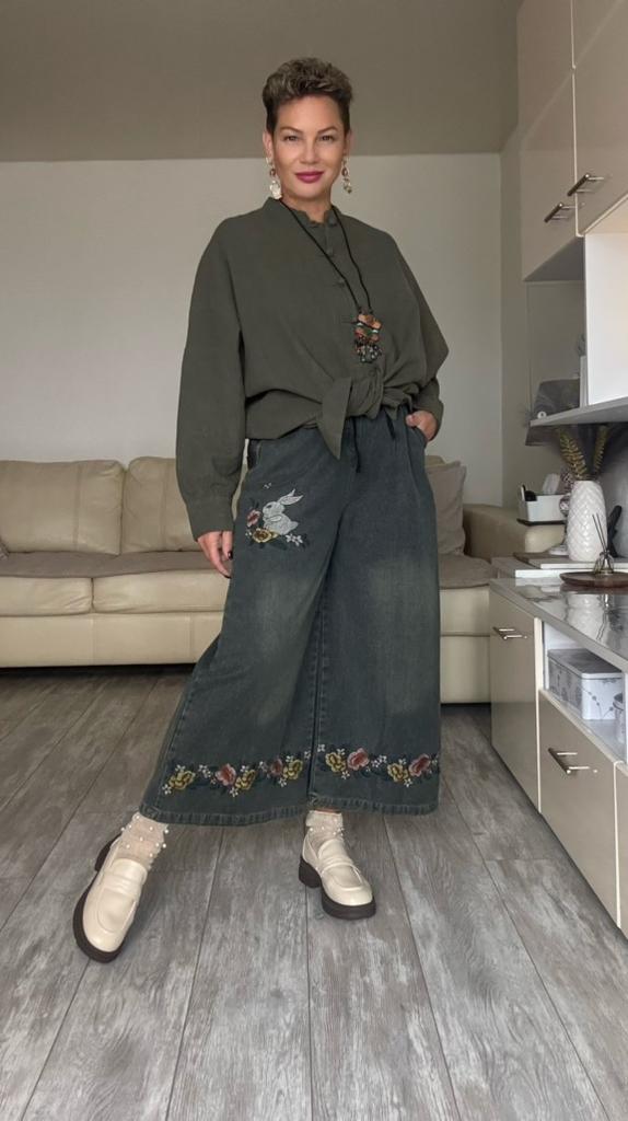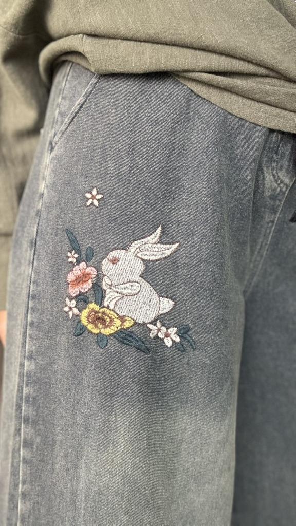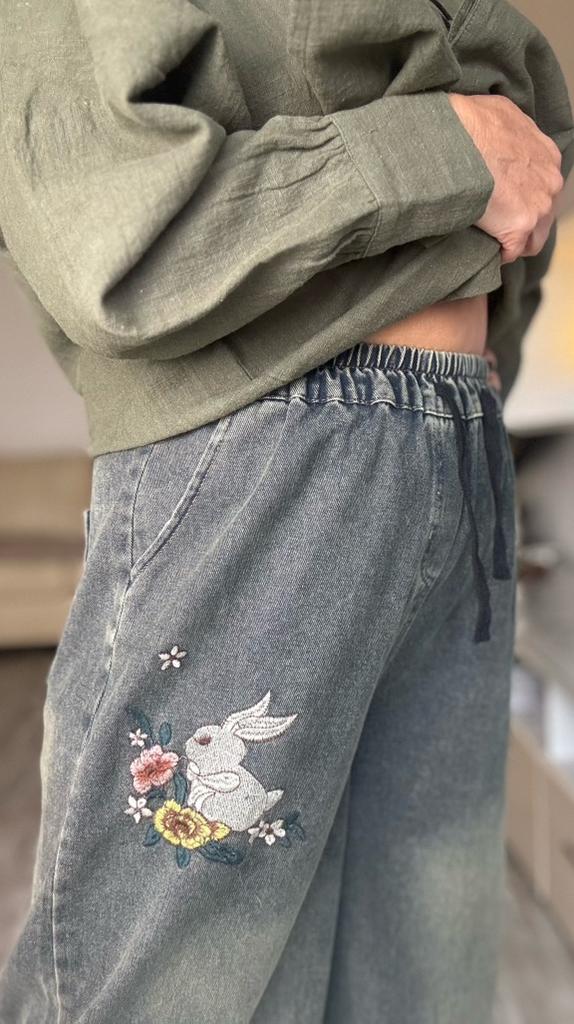 Plus Size Spring Autumn Women Wide Leg Jeans High Waist Drawstring Bunny Floral Embroidery Baggy Denim Pants Vintage Casual Loose Jeans