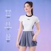 This women's swimsuit set features a quick-dry pleated A-line skirt paired with two-piece shorts, offering a stylish and conservative high-end beachwear option. Designed with a vibrant color block pattern and decorated with eye-catching prints, it combines elegance and functionality. Made from premium polyester material, it ensures comfort and durability, making it perfect for a day at the beach or poolside lounging.