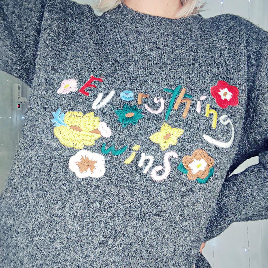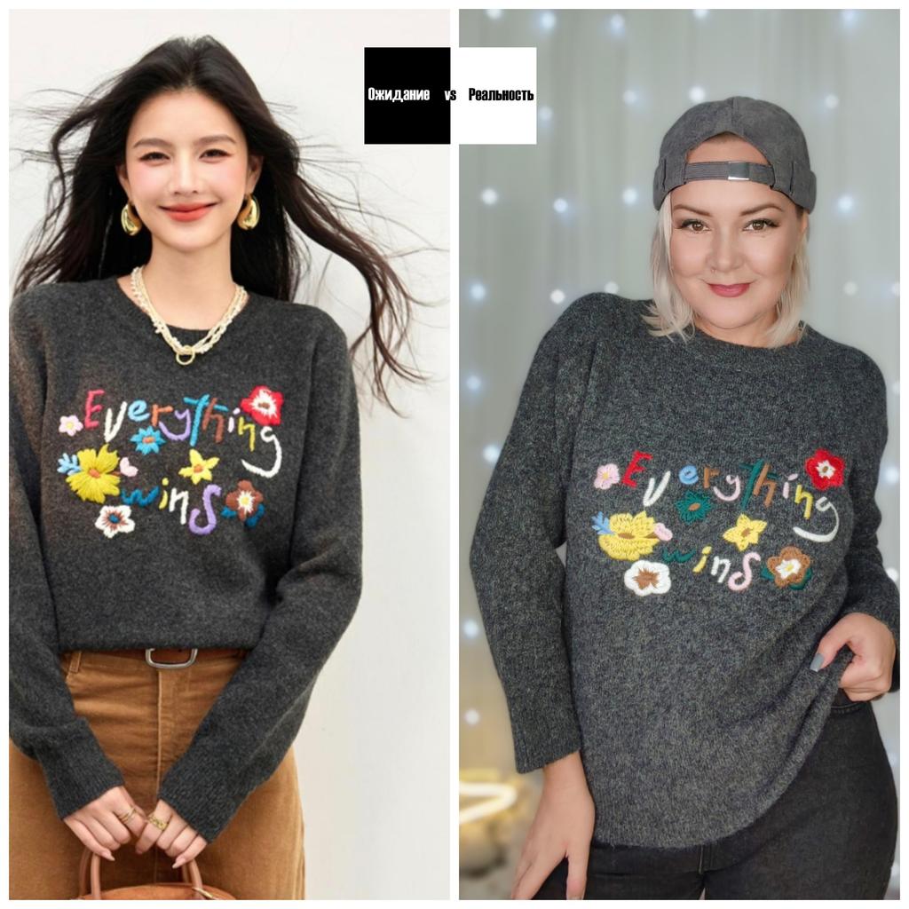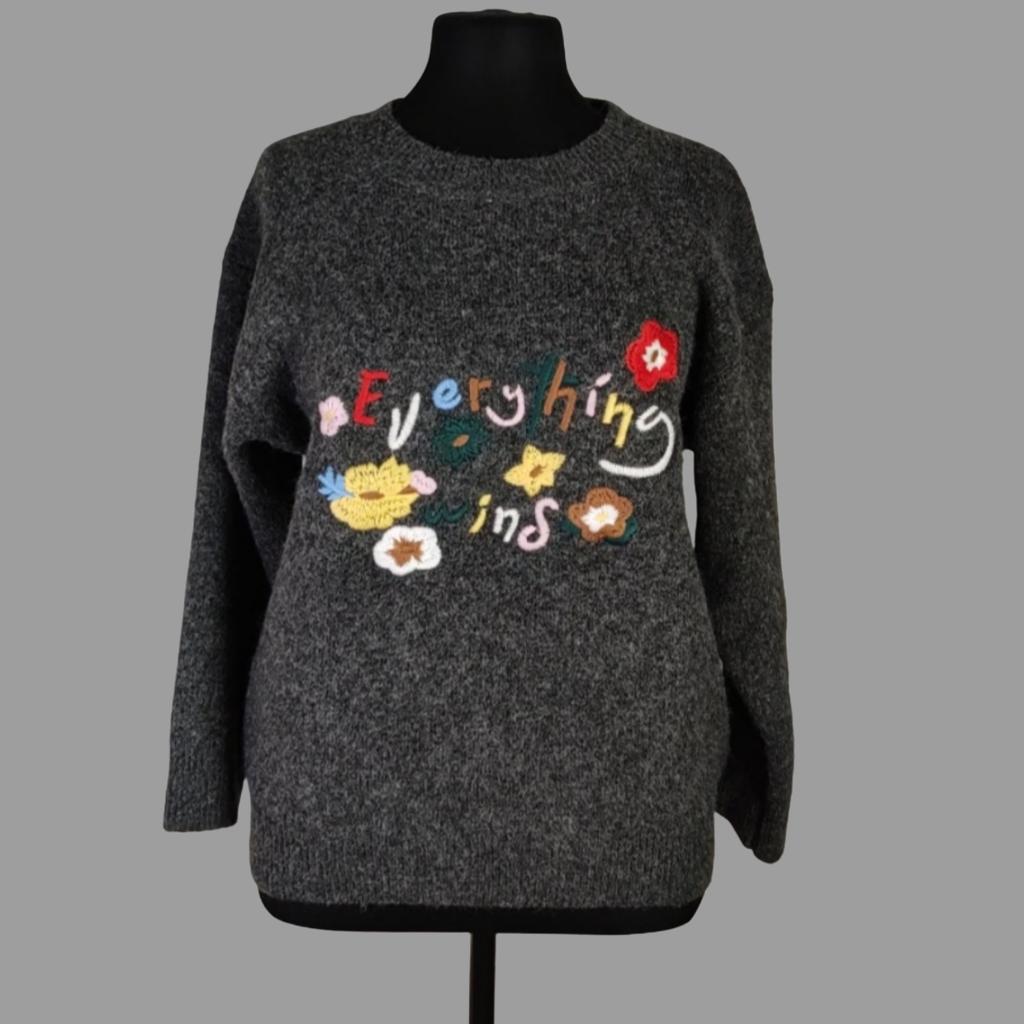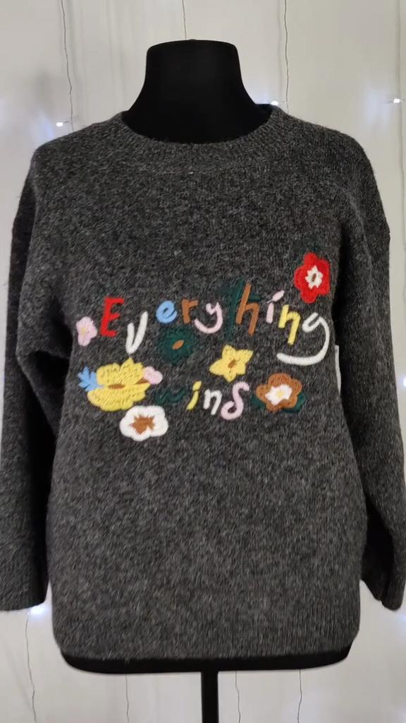 Dimanaf 2025 Women Sweaters Knitting Basic Embroidered Flowers Grey O-Neck Style Loose Pullover Sweater