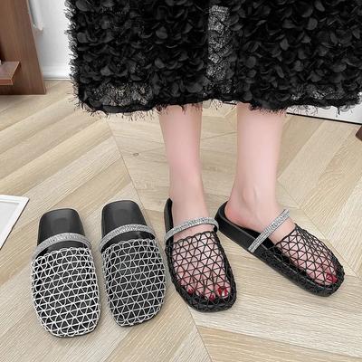 New Woven Mesh Breathable Diamond Strip Flat Bottom Outer Wear Bag Head Slippers Women's Summer Tide Fishing Net Shoes Half Slippers