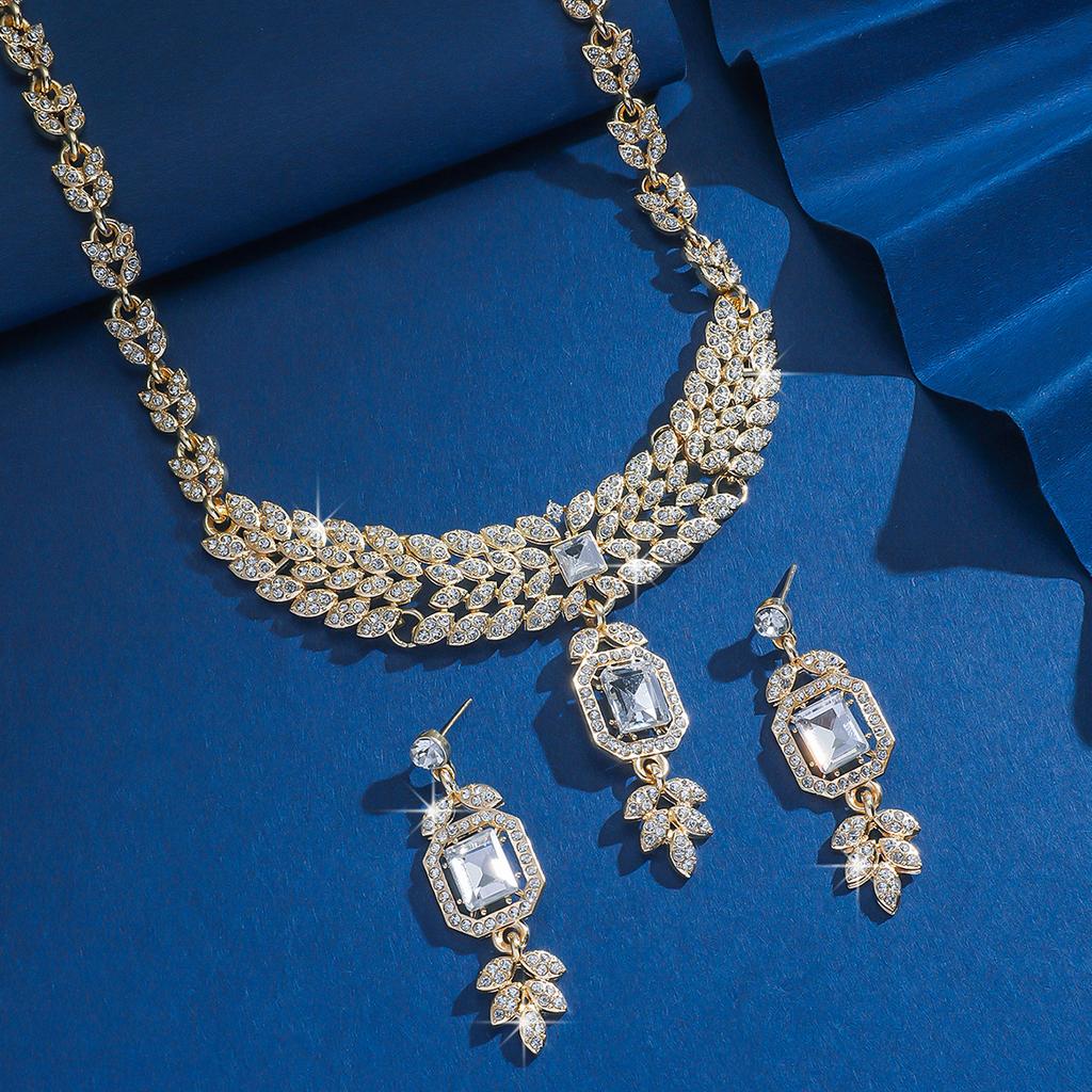3PC Women's Fashion Geometric Square Leaf Necklace Earrings Zircon Set, Suitable for Wedding and Festival Gifts
