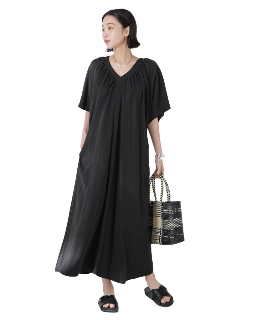 ■ Design ・A one-piece dress that completes your look with just one piece ・Volume gathers around the collar add a feminine element ・Maxi length design for a mature look ・Can be worn in two ways, front and back as a V-neck or crew neck, allowing you to change the look