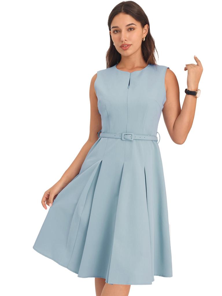 Stay professional and stylish in this elegant dress from Hobemty, featuring a crew neck, sleeveless, zip-up, belted, pleated, flared hem and half-lined lining.