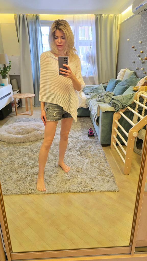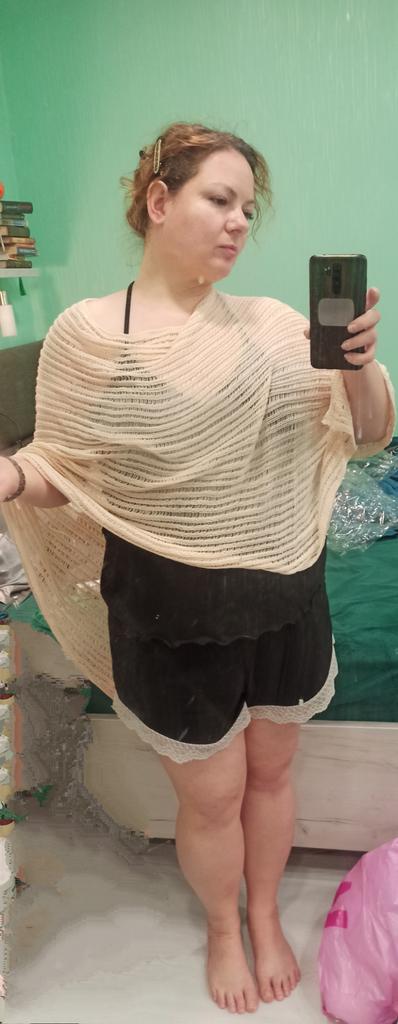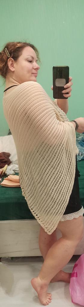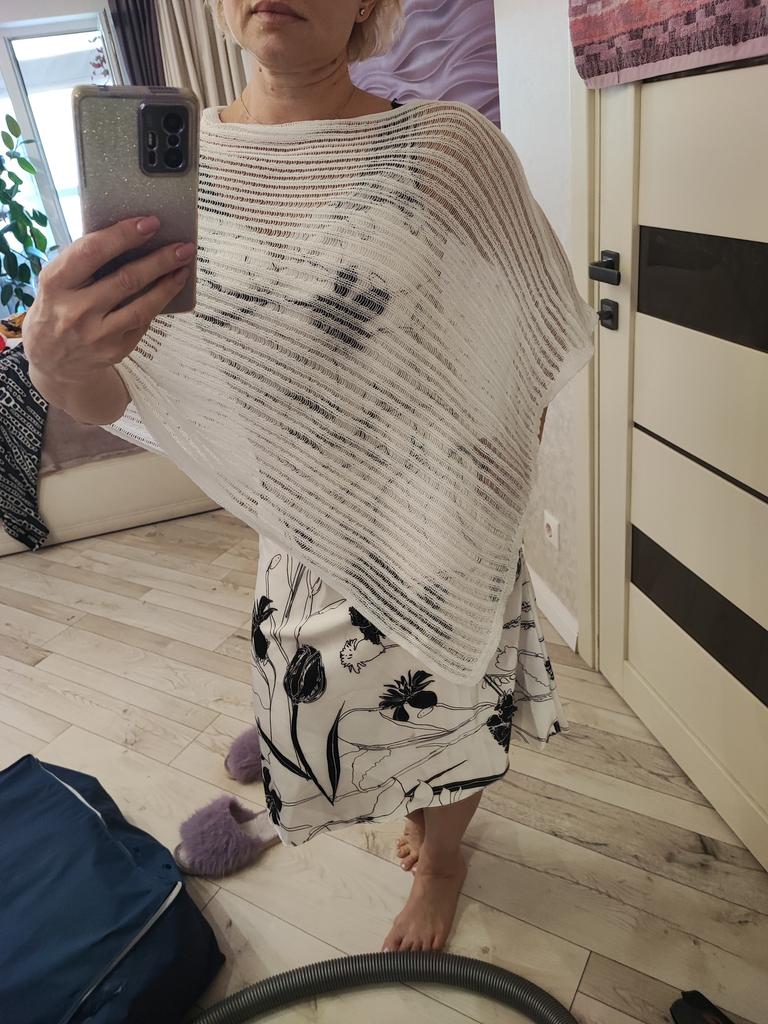 A beautiful cape, useful in cool weather in summer, I tried it on both a dress and a blouse, it looks beautiful, the quality is pleasant.