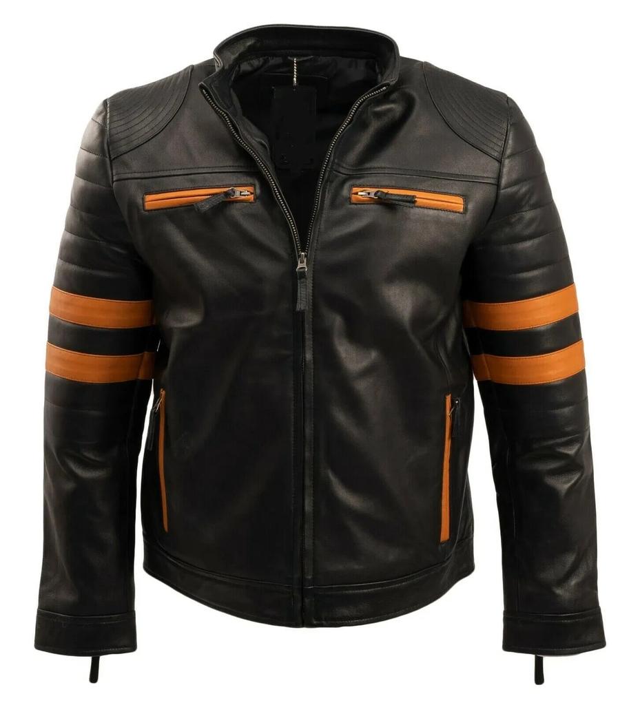 Handmade Moto Stylish Men Original Lambskin Leather Black Biker Jacket Orange Striped