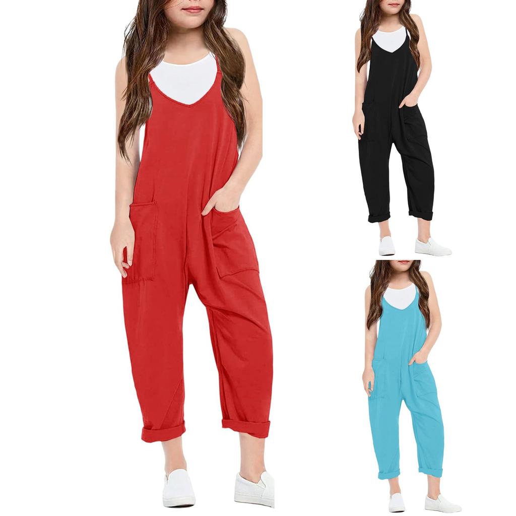 Features: This soft and comfy overall features a slouchy, relaxed-fitting design with a dropped crotch and convenient side pockets. Deep V neck, sleeveless,long pant, back pocket decoration,loose casual jumpsuit with spaghetti strap, soft overalls ,with two side big pockets. Create a flattering loose comfy effect. Match: Girls' Casual Jumpsuit is nice to pair with t-shirts, tank top, blouse, etc. Wear a cardigan or jacket outside the jumpsuit on cool weather. Occasion: The casual fall loose fit long jumpsuits' suit for any occasion, playing outside, birthday party, school daily, home wear, or casual. Garment Care: This spaghetti-strap jumpsuit is super loose and can be taken in your normal . Hand wash cold, soft machine washable. Do not bleach, hang dry. What you get: 1xGirls' Casual Sleeveless Jumpsuits Package-Includes: