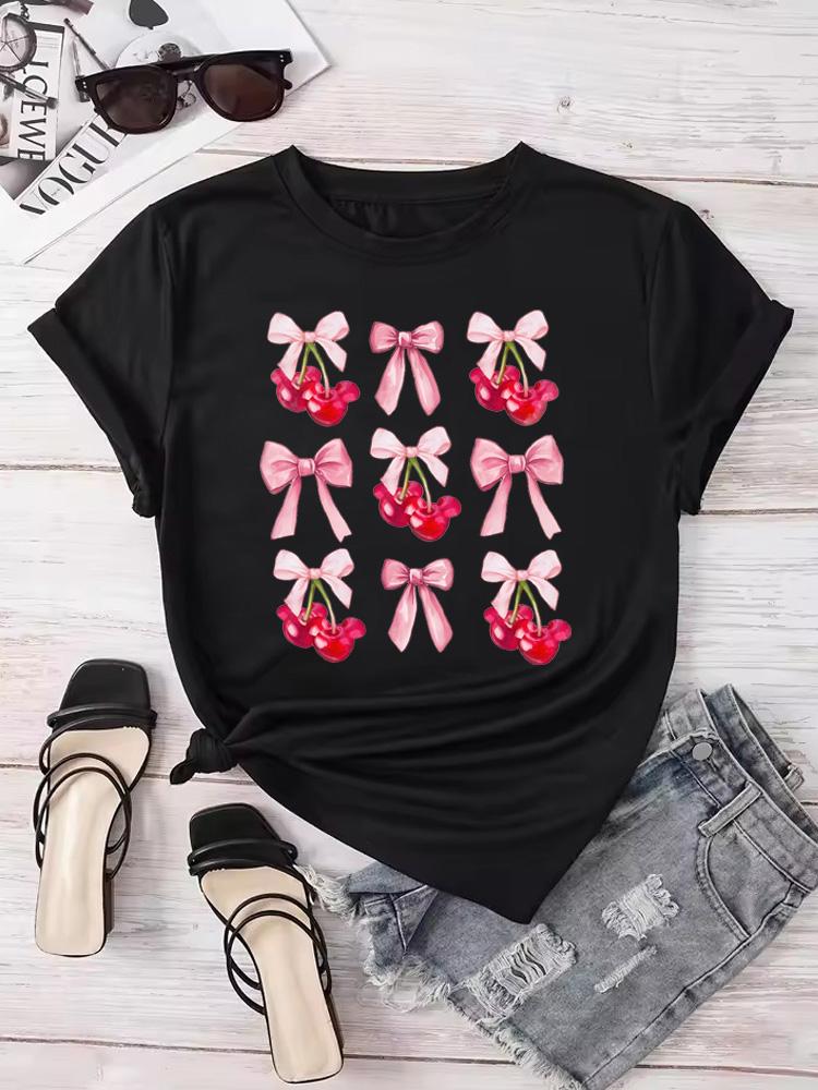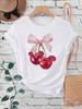 Ovely Style Fashion Summer Women Cherry Bow Print T Shirt Female Casual Top Tshirts Cartoon Graphic Tee T-Shirt
