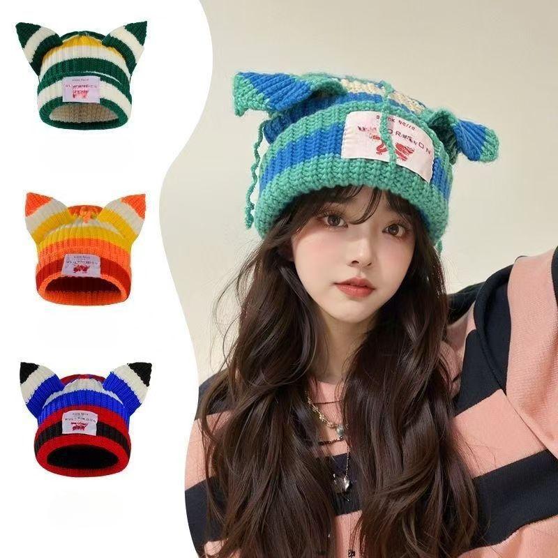 Pig Hat Korean New Contrasting Color Cute Pig Ears Thickened Warm Wool Hat Men and Women Autumn and Winter Color Blocking Knitted Hat