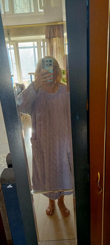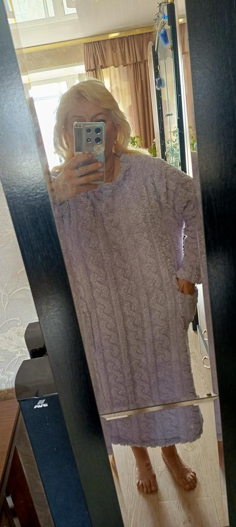 I wanted this so much, Size is large, very loose, will be excellent after a banya in the garden