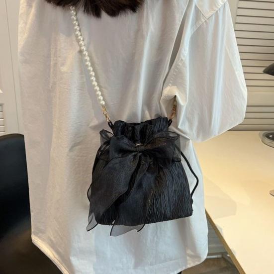 Women Single Shoulder Bag with Detachable Faux Pearl Chain Large Capacity Drawstring Handbag Purse
