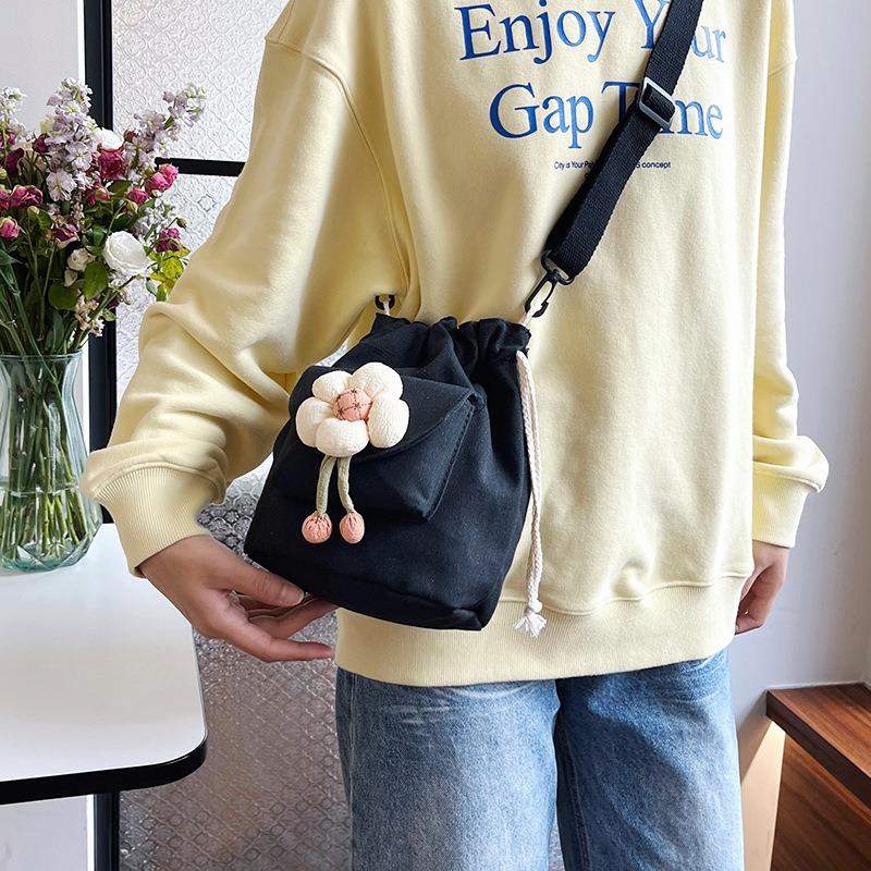 Casual Versatile Shoulder Bag Women's Bag Small Fresh Drawstring Bundle Bucket Bag Cute Flower Canvas Messenger Bag